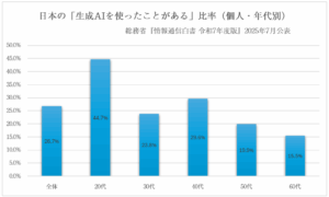 生成AIが身近でない方も多いと思います、私も直近までその一人でした、総務省による調査では下記のような統計データが発表されていて、30代の私は残り8割側でした。